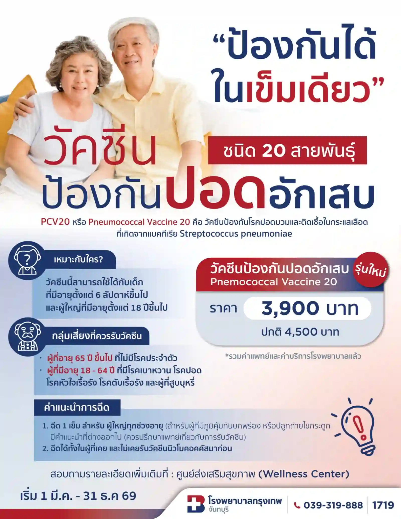 - จุดเด่น: ครอบคลุมเชื้อนิวโมคอคคัสได้กว้างขึ้นเป็น 20 สายพันธุ์